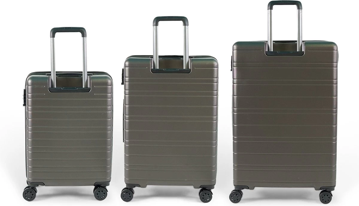 Ontsnappen aan het dagelijks leven met de tripple Amsterdam NO.9 kofferset. De Amsterdam lijn wordt gesierd door eenvoud. Reiskoffers met een modern strakke uitstraling met minimalistische klasse. Cloudy Grey die deze klasse een eigentijdse en klassieke uitstraling geeft. Tel hier hier de inhoud bij op en je hebt echte winnaars. De koffers bieden je namelijk alle ruimte om mee te nemen wat je wilt. De kleine koffer is perfect voor je handbagage, zodat je de essentials altijd bij de hand hebt. De middelgrote en de grote koffer zorgen ervoor dat je zorgeloos weken op vakantie kunt en genoeg kleding bij je hebt. Daarnaast zijn de koffers lichtgewicht dus reizen blijft easy breezy. De gestroomlijnde wieltjes dragen daar zeker aan bij. De vierdubbele 360 graden spinners zorgen er namelijk voor dat jouw koffers op rolletjes lopen. Letterlijk. Nog nooit ging het lopen met koffers zo soepel. Maak het jezelf helemaal comfortabel door de pushbar in te stellen op de juiste hoogte. Je zou er bijna een extra rondje mee lopen zo soepel gaat het, maar hey you’ve got a flight to catch!
