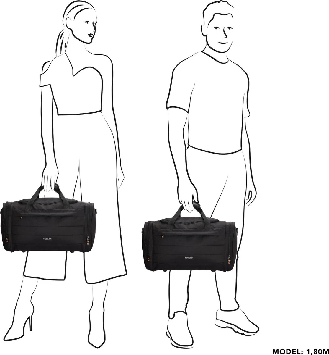 Handbagage formaat reistas van het merk Beagles Originals. Ritsvak voorop en groot hoofdvak met ritssluiting in U-vorm waardoor de tas mooi opent en je goed je spullen erin kunt opbergen. Op beide zijkanten zit een ritsvak, handig om kleinere reisaccessoires in op te bergen. De twee handvatten zijn samen te binden middels een lip met klittenband. Met de afneembare, verstelbare schouderband kun je deze tas ook over de schouder dragen.