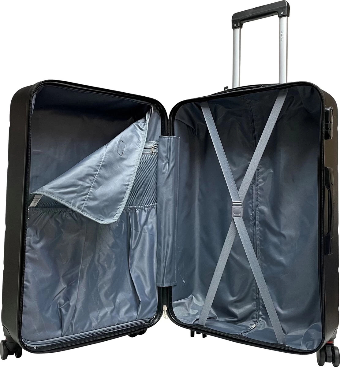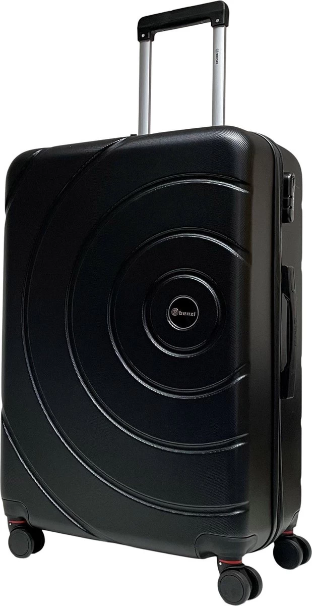 Grote hardschalen koffer van het merk Benzi. De koffer is voorzien van een ritssluiting rondom die op slot te zetten is middels een vast cijferslot op de zijkant van de koffer. Binnenin gevoerd, spanbanden en tussenschot met ritssluiting. Op het tussenschot zit een ritsvak en twee steekvakken voor het overzichtelijk opbergen van kleine reisaccessoires.