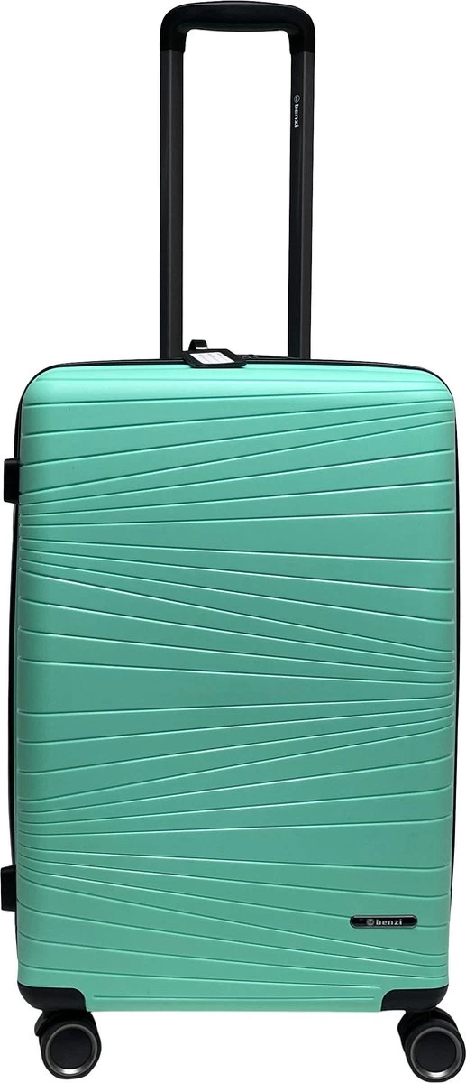 Middelgrote hardschalen koffer van het merk Benzi, gemaakt van lichtgewicht polypropyleen. De koffer is voorzien van een ritssluiting rondom die op slot te zetten is middels een vast cijferslot op de zijkant van de koffer. Binnenin gevoerd, spanbanden en tussenschot met ritssluiting. Op het tussenschot zit een ritsvak en twee steekvakken voor het overzichtelijk opbergen van kleine reisaccessoires. Handvat op bovenkant en zijkant, uitschuifbare trekstang en comfortabel 4-wiel systeem. Voorzien van adreslabel.