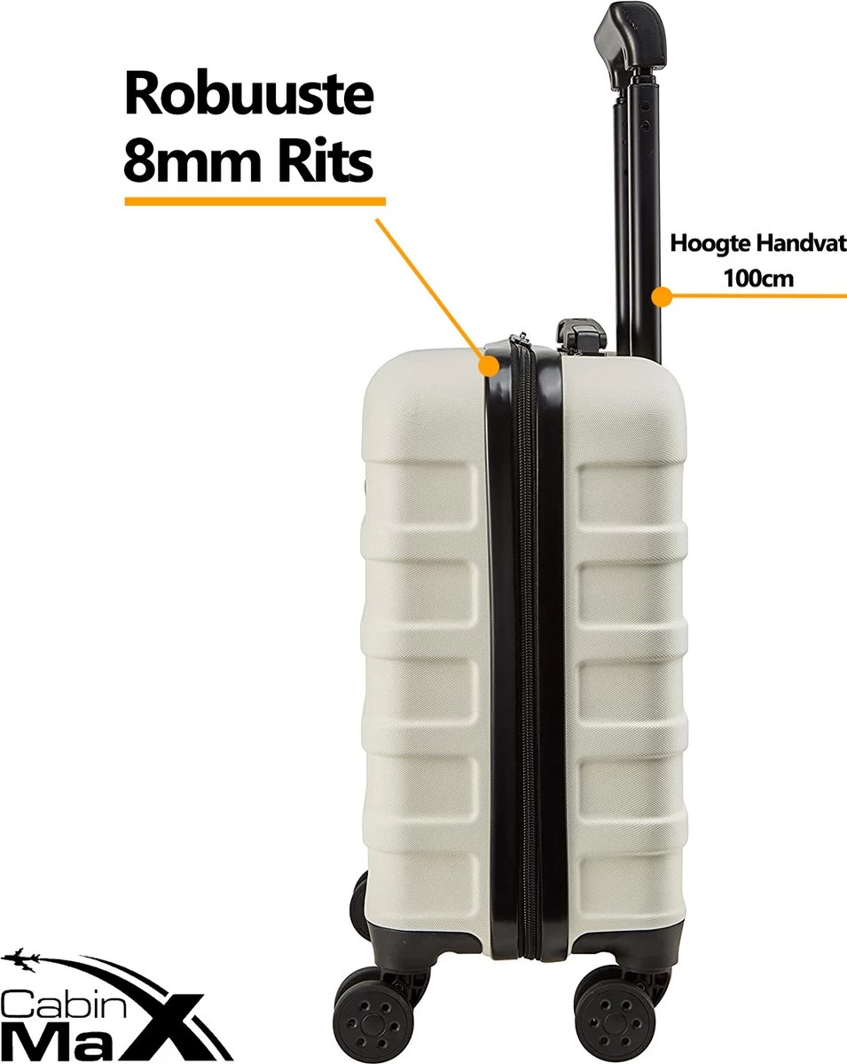 Deze handbagage koffer van het merk Cabin Max, serie Anode, kenmerkt zich door zijn textuur. De koffer beschikt over vier stabiele spinner wielen die een volledige draai mogelijk maken. Daarnaast is de koffer voorzien van handvatten op de bovenkant en verstelbare banden om het inpakken gemakkelijker te maken en verschillende vakken.