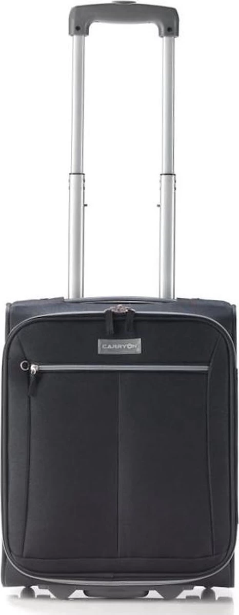 Carry On kleine stoffen handbagage koffer. De koffer heeft aan de bovenkant een handvat, op de voorzijde een ritsvak en op de achterzijde een insteekvakje voor adreslabel. Binnenkant heeft een mooie blauwe voering. Koffer is voorzien van spanbanden en een extra ritsvak in de binnenkant van de klep. De koffer heeft 2 wielen en verstelbare, uitschuifbare trekstang. Door het compacte formaat van deze handbagage koffer voldoet deze aan bijna alle maximaal toegestane afmetingen van de diverse luchtvaartmaatschappijen.