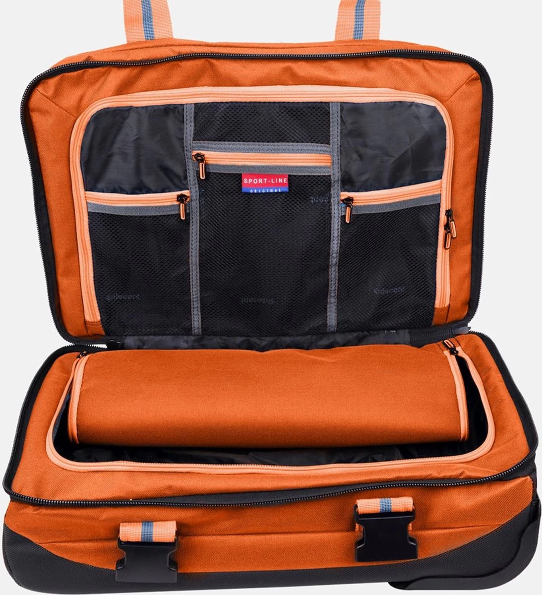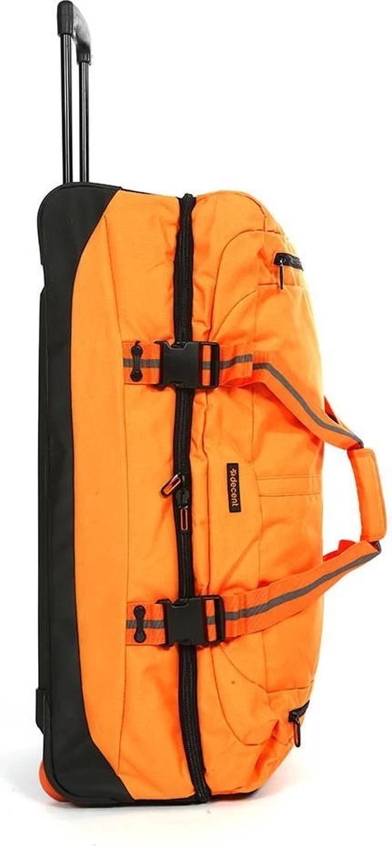 Grote wieltas uit de Sport-Line serie van Decent. De reistas heeft twee soepele wieltjes, een verstelbare trekstang en twee handvatten waardoor de tas gemakkelijk overal mee naar toe te nemen is. Aan de binnenzijde van de tas bevinden zich twee gescheiden compartimenten die worden afgesloten met een rits. Binnenin zitten tevens veel ritsvakjes voor het overzichtelijk opbergen van kleine reisaccessoires. Op de voorzijde van de tas zitten twee ritsvakken. De spanbanden aan de zijkanten maken het mogelijk om bagage zo compact mogelijk te maken. Thuis is de reistas makkelijk plat te maken en op te bergen.