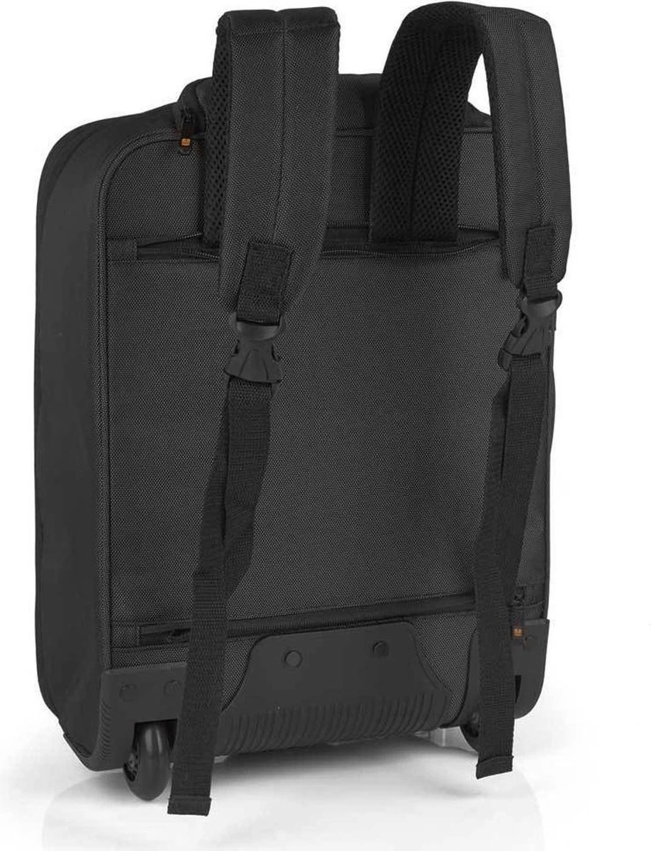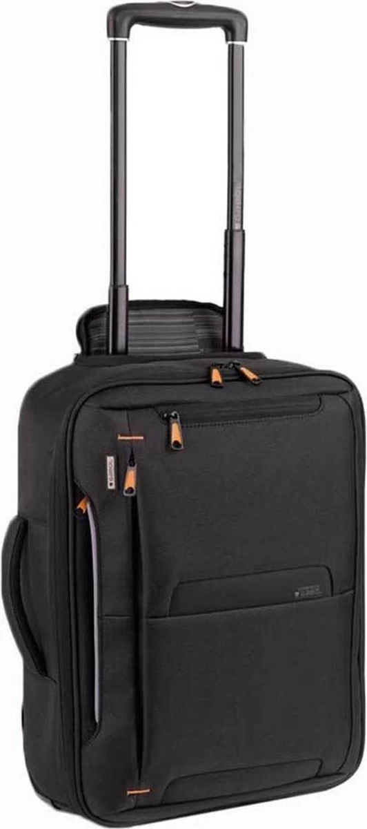 Compacte laptop rugzak trolley in handbagage formaat. Multifunctioneel en ideaal voor zakelijk gebruik. Het grote hoofdvak biedt ruimte voor bagage of 2 dikke zakelijke ordners en is voorzien van een gewatteerd laptopvak voor een 15,6 inch laptop. Op de voorzijde zit een groot verticaal ritsvak waar A4 formaat documenten inpassen en waarin een organizer zit voor het overzichtelijk bergen van bijv. telefoon, pennen, creditcards etc. Daarnaast heeft deze laptop koffer op de voorzijde nog twee kleine extra ritsvakjes voor bijv. sleutels en/of (zonne-)bril. Op de achterzijde zit een ritsvak waarin twee rug-/schouderbanden verborgen zitten. Indien u deze eruit haalt kunt u deze trolley ook als rugzak gebruiken. Trolley heeft een handvat, twee wielen en een verstelbare, uitschuifbare trekstang.