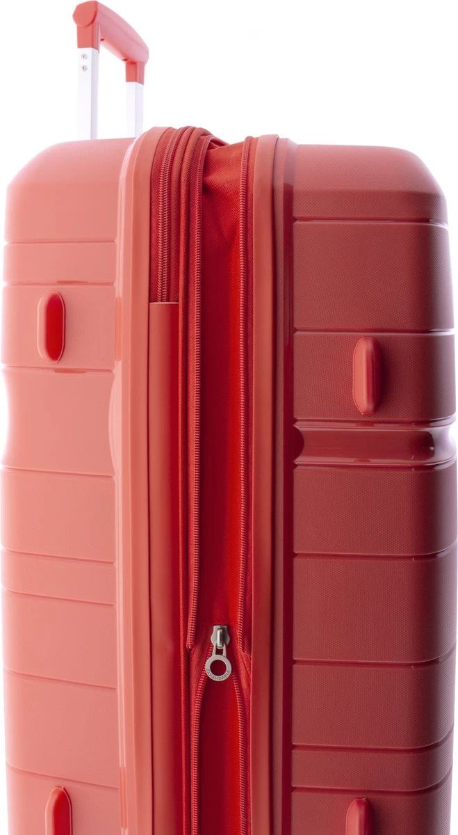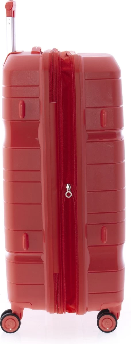 Middelgrote luxe hardschalen, popypropyleen koffer met dubbele wielen en TSA slot. Koffer is voorzien van een ritssluiting rondom en extra expandable rits waarmee de koffer qua volume te vergroten is van 70 naar 80 liter. Binnenin gevoerd en voorzien van tussenschot met ritssluiting, ritsvakje en spanbanden. Koffer is op slot te zetten middels een vast TSA cijferslot op de zijkant van de koffer. Handvat op boven- en zijkant en voorzien van comfortabel 4-wiel systeem. Afmetingen: 67 cm hoogte x 46 cm breedte x 27-30 cm dikte. Kenmerken: middelgrote kofferexpandable (te vergroten van 70 naar 80 liter)binnenin gestoffeerdtussenschot met ritsspanbandenhandvat op bovenkant en zijkant4 zwenkwielenuitschuifbare trekstangTSA slot