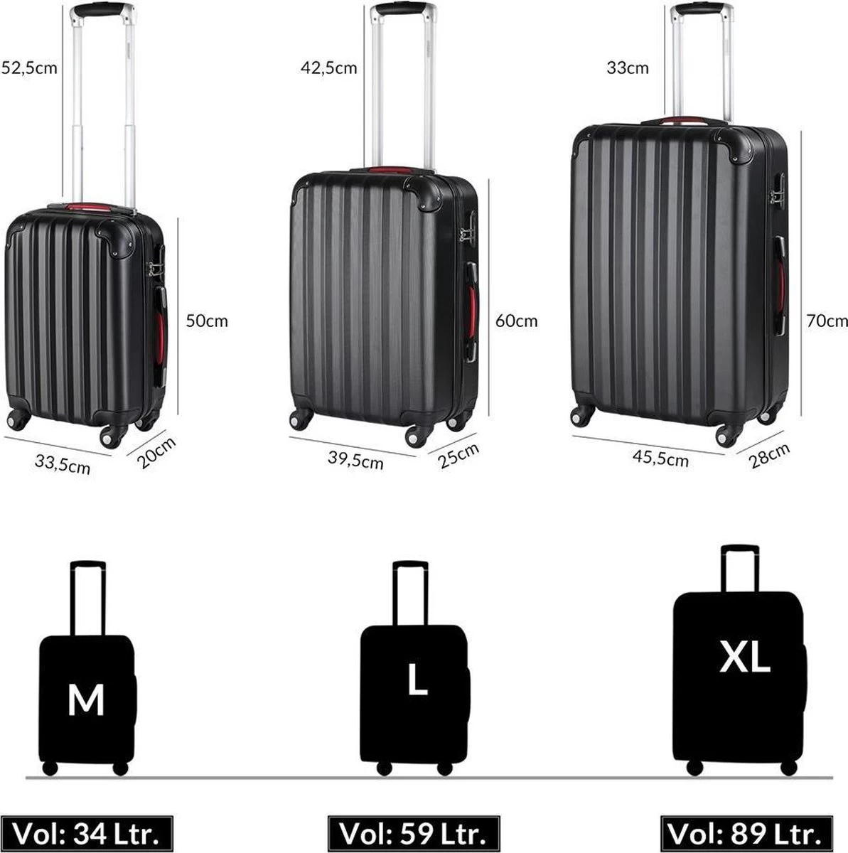 - Handvatten uitgetrokken – handvat van onder naar boven: 95cm (voor alle kofferafmetingen)