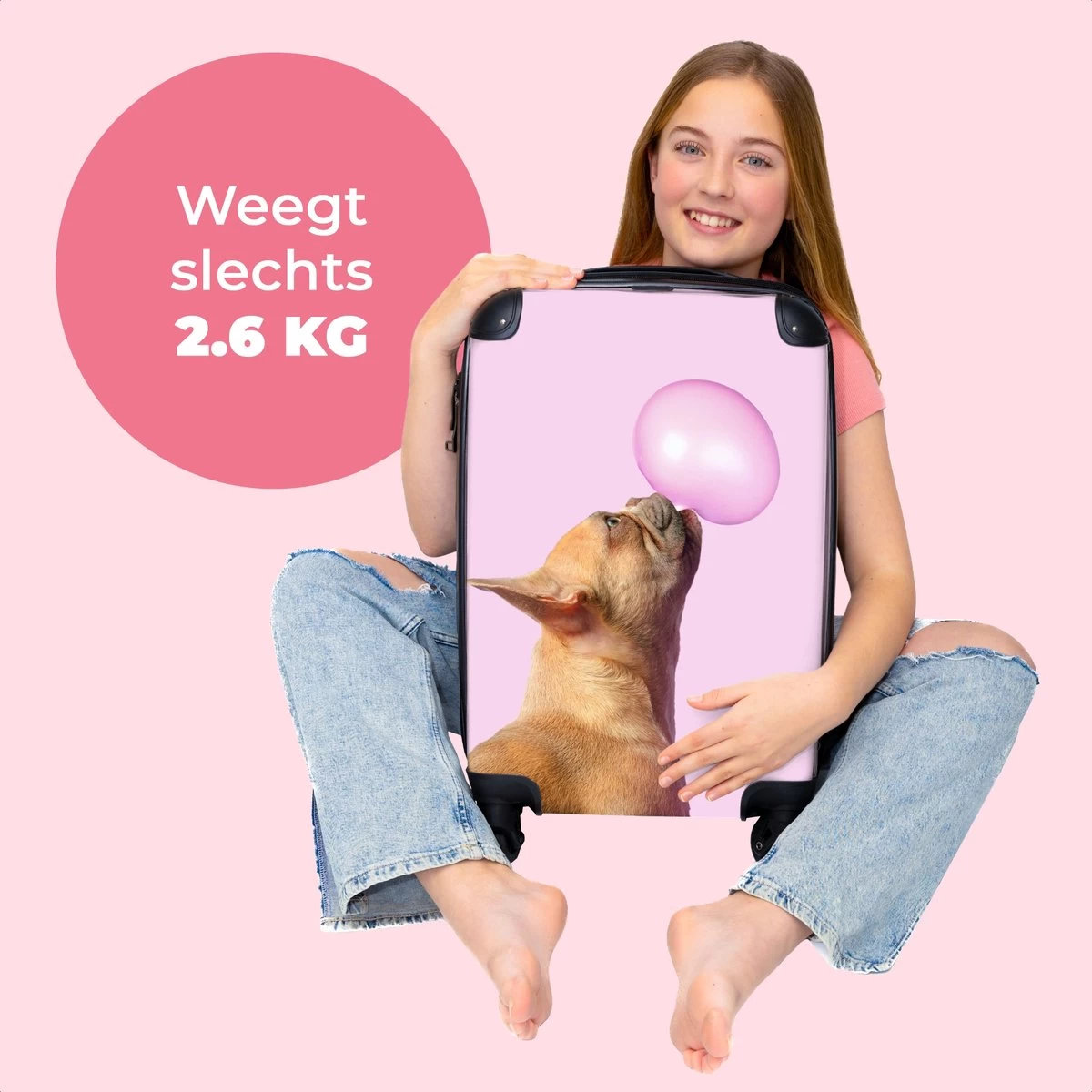Ben jij nog op zoek naar een unieke en grappige kinderkoffer? Dan is dit het perfecte product voor jou! De koffer bevat een afbeelding van een hond die een kauwgumbel blaast.