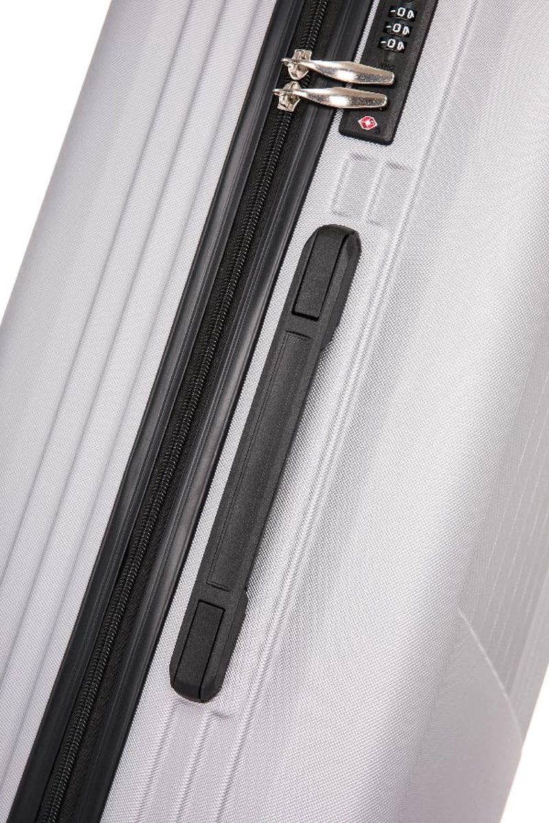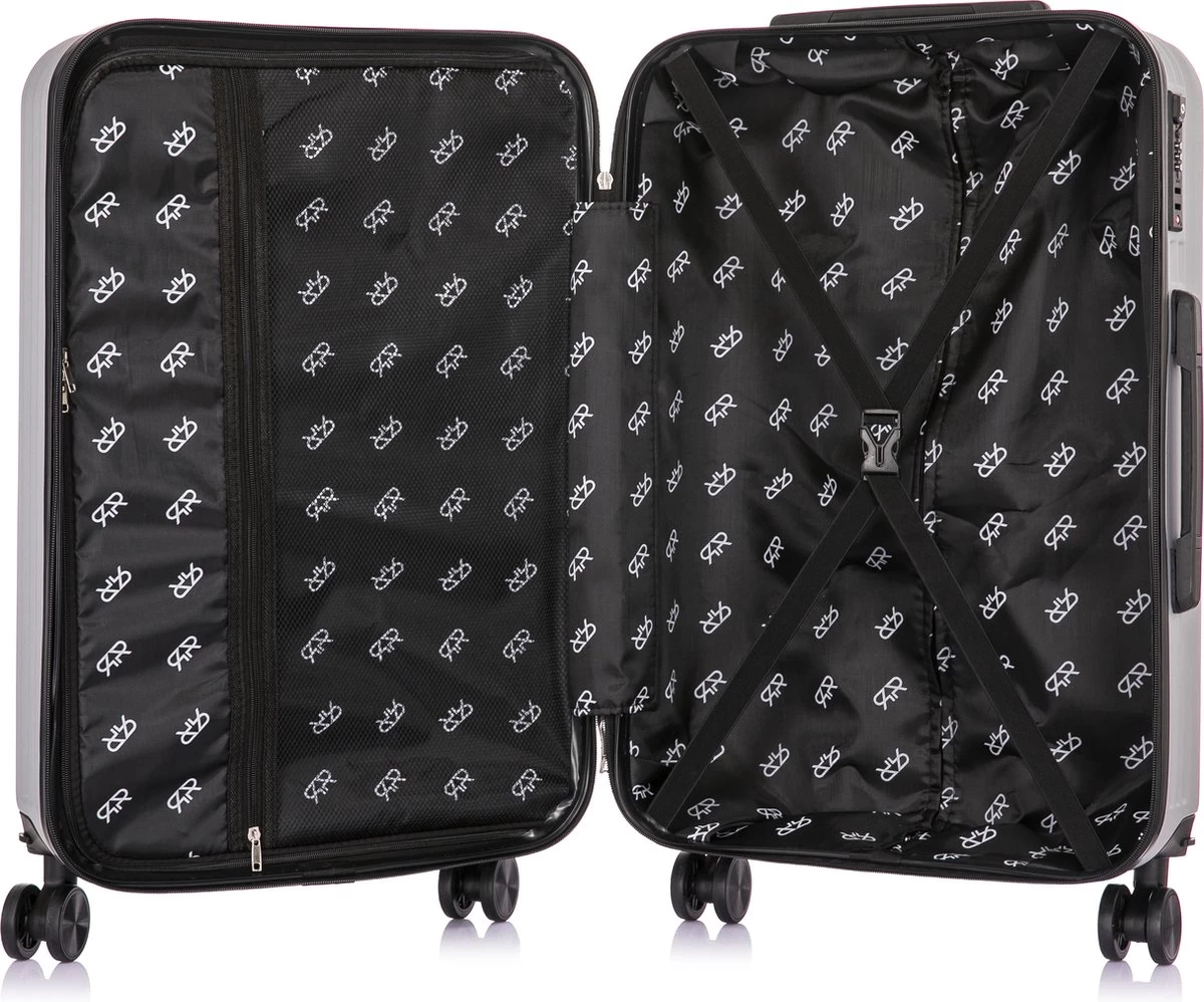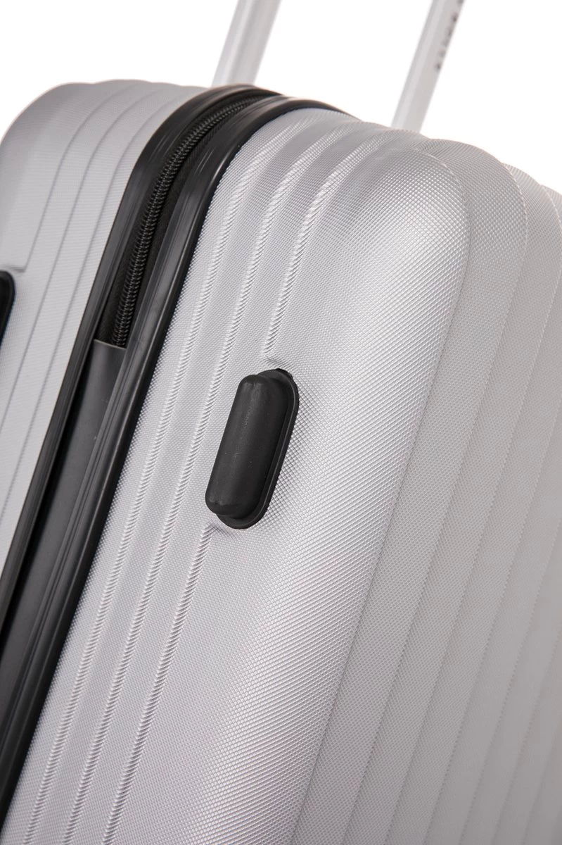 Hardschalen ABS handbagage koffer. Koffer is voorzien van een ritssluiting rondom. Binnenin gevoerd en voorzien van tussenschot met ritssluiting en spanbanden. Koffer is op slot te zetten middels een vast cijferslot op de zijkant van de koffer. Handvat op bovenkant en voorzien van een comfortabel 4-wiel systeem.