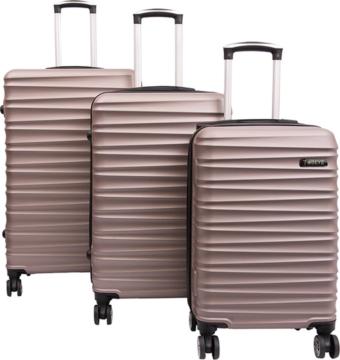 De set bevat drie koffers van verschillende grootte. De kleinste koffer heeft als afmetingen 50 x 34 x 26 centimeter. Deze trolley kun je meenemen als handbagage in het vliegtuig. Hij voldoet daarvoor aan de standaard maten. De medium koffer is 60 x 42 x 28 centimeter en de grootste meet maar liefst 70 x 46 x 32 centimeter. Genoeg koffers dus voor het hele gezin.