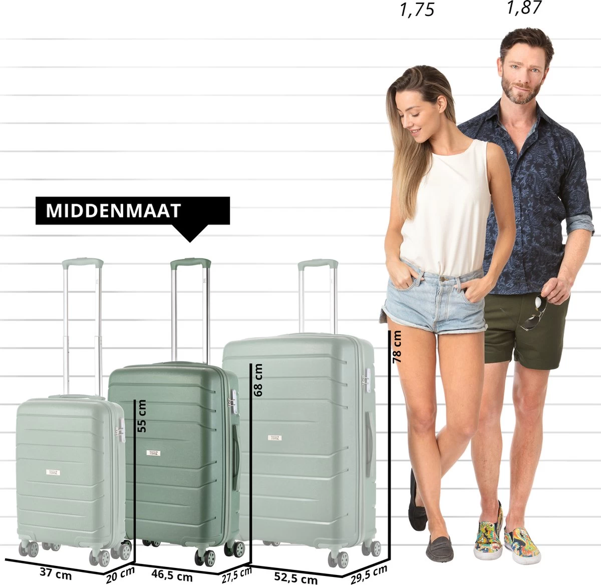 De TravelZ Big Bars is al jaren één van de best verkochte koffers van het Nederlandse merk TravelZkoffers. De Big Bars koffers zijn een echte lichtgewicht, erkend met een internationaal TSA-cijfercombinatieslot, soepele trekstang in verschillende standen voor lange en kleine personen, 4 dubbele wielen die volledig rondraaien, een compleet interieur met ritsvak en spanbanden en gemaakt uit ijzersterk polypropyleen. Voordeel van dit materiaaltype is dat het materiaal meeveert en hierdoor bij een enorme impact geen inslag krijgt. Meerdere koffers? Zoek op de TravelZ Big Bars kofferset en pak je prijsvoordeel bij twee of drie koffers. Bekijk kritisch welk formaat koffer je qua afmetingen en literinhoud nodig hebt voor de reis. Afmeting is incl wielen.