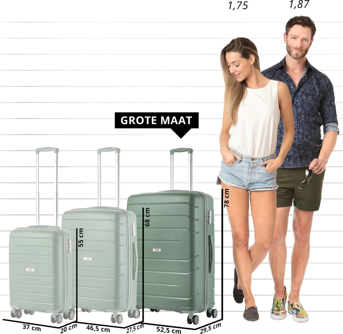 De TravelZ Big Bars is al jaren één van de best verkochte koffers van het Nederlandse merk TravelZkoffers. De Big Bars koffers zijn een echte lichtgewicht, erkend met een internationaal TSA-cijfercombinatieslot, soepele trekstang in verschillende standen voor lange en kleine personen, 4 dubbele wielen die volledig rondraaien, een compleet interieur met ritsvak en spanbanden en gemaakt uit ijzersterk polypropyleen. Voordeel van dit materiaaltype is dat het materiaal meeveert en hierdoor bij een enorme impact geen inslag krijgt. Meerdere koffers? Zoek op de TravelZ Big Bars kofferset en pak je prijsvoordeel bij twee of drie koffers. Bekijk kritisch welk formaat koffer je qua afmetingen en literinhoud nodig hebt voor de reis. Afmeting is incl wielen.