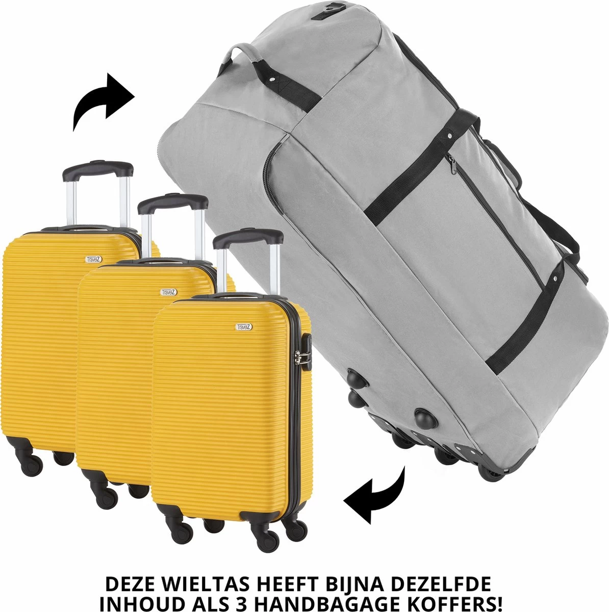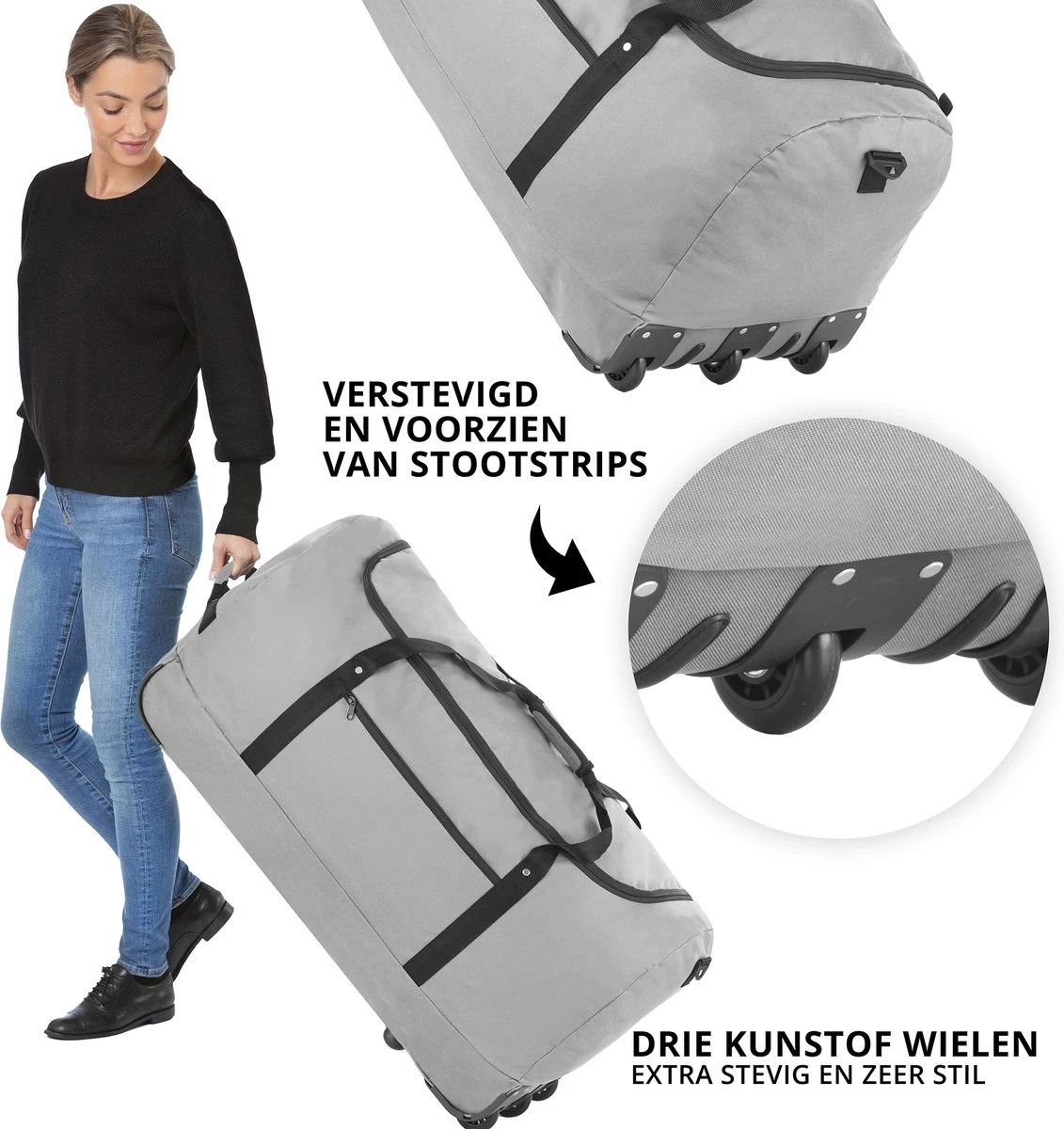 De TravelZ wieltas is makkelijk op te vouwen tot een klein pakketje en zeer ruim met 100 liter. De 3 geïntegreerde wielen zijn comfortabel in gebruik (let op dat wanneer deze leeg is, iets meer wiebelt), vervaardigd uit polyester, bevat een handvat aan de bovenzijde en is in 2022 vernieuwd op basis van consumentenfeedback. Er zijn rubberen beschermdoppen aangebracht op de onderzijde en ook extra beschermrubbers op de stof. De tas is op 3 punten verstevigd.